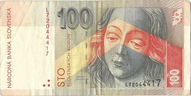 Na Slovensku sa od vzniku štátu v roku 1993, až do konca roka 2008 platilo slovenskými korunami. Stokorunová bankovka bola venovaná Levoči. Zatiaľ čo na rube sú zobrazené architektonické dominanty mesta - radnica, farský kostol a plus svorník zo starého minoritského kostola, na prednej strane je detail tváre sochy Panny Márie od Majstra Pavla z Levoče. Za jej prítomnosť na bankovke však vďačíme náhode.