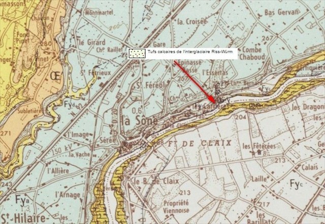 Dated from the interglacial Riss-Würm, the cluster of tufa of the Sône forms a crust about thirty meters thick over a length of the order of 2 km.