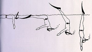 Phase 1: From a still or gliding position, after a last breath, using the arms, the torso is tilted perpendicularly to the legs that remain in the water.