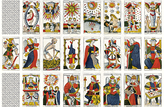 Apparues en 1375, les cartes à jouer commencèrent au XVe siècle à servir de réceptacle de symboles en rapport avec les dieux et les planètes. Le tarot est une forme de jeu de cartes créée en Italie du Nord dans les années 1440 et importée en France au début du XVIe siècle. Les 22 atouts d’un jeu de tarots (les arcanes majeurs) s’associent à 56 arcanes mineurs formant ainsi un jeu de 78 cartes.
