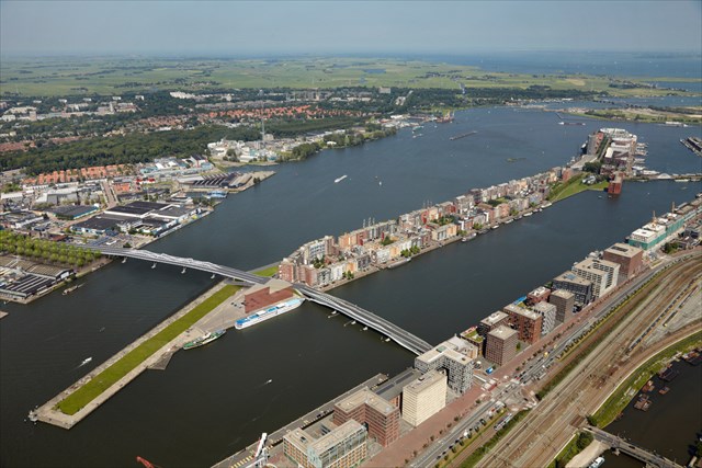 Op moment van het leggen van deze cache is het duidelijk dat de brug ongeveer op de plek waar je nu staat aan land komt. Hij komt in het verlengde te liggen van de Jan Schaeferbrug, die het centrum verbindt met het Java-eiland. Waarschijnlijk vervolgt de brug de richting van de Jan Schaeferbrug of ga je eerst even opzij waarna je rechts van deze plek uitkomt bij het Motorkanaal. Hieronder zie je een ‘artist impression’ van hoe de brug er op deze plek uit zou kunnen zien (bron: Het Parool). UPDATE: na een aantal maanden wordt steeds duidelijker dat je vanaf de Jan Schaeferbrug waarschijnlijk eerst een stukje naar links moet en de brug niet zoals op het plaatje bij de Boorstraat aan land komt, maar bij de Motorwal, waar je nu staat (de cache is daarom naar deze plek verplaatst). Het begin van het water van de Motorwal is op het plaatje nog net te zien aan de linkerkant.
