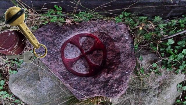 Stenen kan vippes og dækker over et lille hulrum, kun lige stort nok til en nøgleboks.