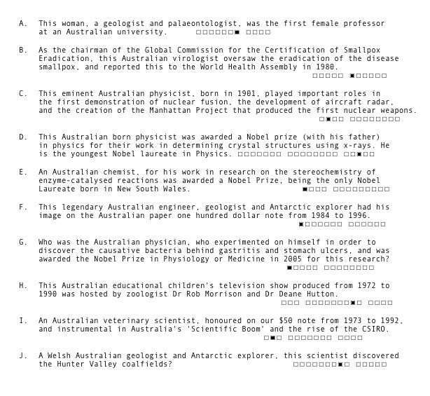Answer the following questions about some of our most eminent scientists, the cache is found at S 32° AB.CDE' E 151° FG.HIJ'. Fill in the blanks with the answer, a letter is counted as the digit (or second digit) of it's corresponding number ie A=1, J=0, Z=6