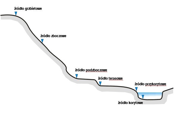 Pod względem usytuowania morfologicznego, w omawianym rejonie źródła można podzielić na: