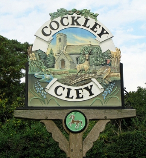 The village sign for Cockley Cley shows it's church, All Saints, one of 124 existing round-tower churches in Norfolk. However on 29th August 1991 the medieval tower collapsed. The church was "restored" between 1866-88 by Richard Phipson, but most of the original medieval building was lost to the restoration.