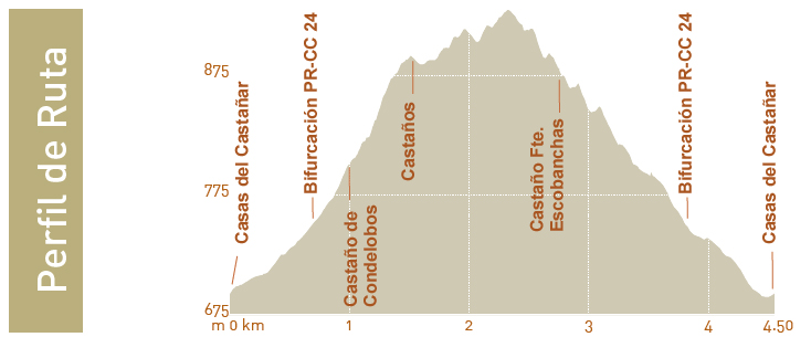 Desde la zona más alta de Casas del Castañar, se inicia el sendero (waypoint disponible) por una calle que se convierte en camino cementado entre fincas. Poco a poco va ganando altura y se separa del PR-CC 24 (ruta de la era de San Bernabé) para internarse en zona de castaños en la que observamos el primer castaño centenario en el paraje de Condelobos. Continuamos en ascenso pasando por otros castaños espectaculares pero anónimos hasta llegar a un camino entre robles y un claro del bosque, desde donde ya en descenso abandonaremos el camino a la altura de un panel temático junto a los castaños de la Fuente de las Escobachas por una estrecha senda a la derecha. A los pocos metros tomaremos otro camino que en bajada nos acerca al pueblo entre cerezales hasta llegar a las primeras casas de Casas del Castañar, donde finaliza la ruta.