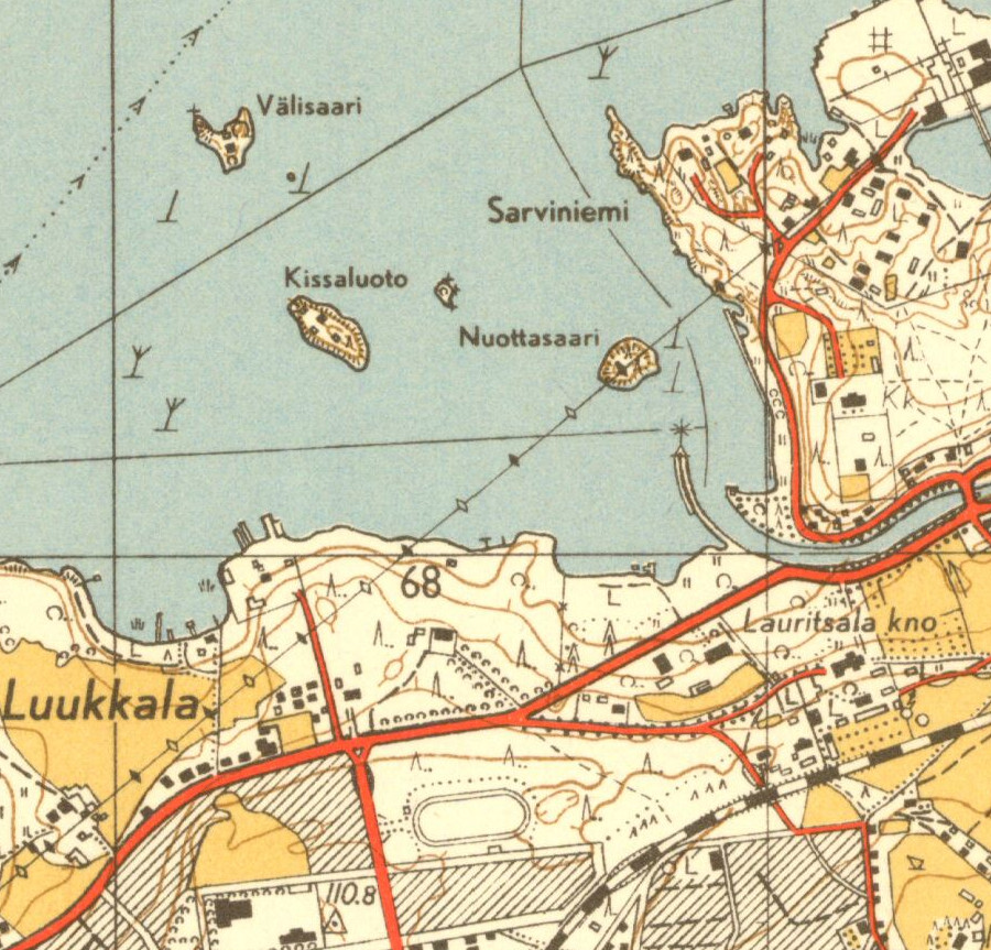 [EN] Nuottasaari (Web Island) used to be an island on the mouth of Saimaa canal and the ship lane went from the island's eastern side. When the canal was widened in 1963-68 the earth removed from the canal was used to fill the gap between continent and Nuottasaari. The concrete foundations near the cache are what remains of a cable post used to move sawdust from a sawmill. The cache is hard to find in winter if there is very much snow.