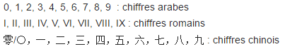 Les chiffres utilisés de nos jours sont majoritairement les chiffres arabes. Il y a toutefois d'autres notations telles que les chiffres romains ou encore chinois.