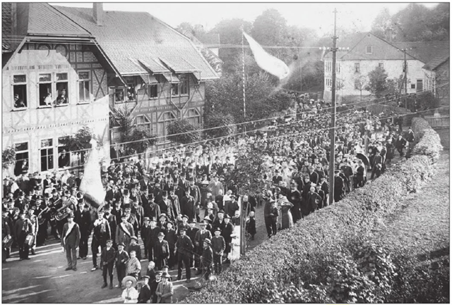 Wenn sich die Thüringer Chöre zu gesanglichen Wettstreiten trafen, so wurde dies gewöhnlich mit einem Festumzug begangen. So auch hier um 1900 vor dem Henneberger Haus.