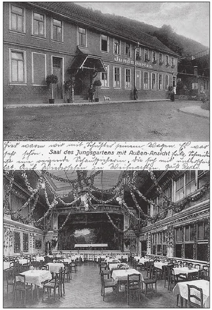 Auf dieser Postkarte sehen wir die Außenansicht und den Saal der Gaststätte „Jungsgarten“ in der Koberstraße 2. um 1930. Auf manchen alten Stadtplänen ist die Straße auch als Sandstraße eingezeichnet. Der herrliche Saal mit Bühne und Empore war schon vor 1945 sehr beliebt. Mit der Neugründung der Karnevalsgesellschaft „IKALLA“ wurde der Saal auch eine närrische Hochburg. Auch die BSG „Motor West“ Suhl nutzte den Saal für die Akrobaten und Tischtennisspieler, ebenso waren im Gasthaus ein Billard und eine Kegelbahn vorhanden. Die Schließung erfolgte 1975.