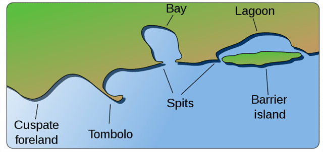 Some of the features formed by wave-deposited sand are in the picture below. These features include barrier islands and spits. A spit is sand connected to land and extending into the water. A spit may hook to form a tombolo.