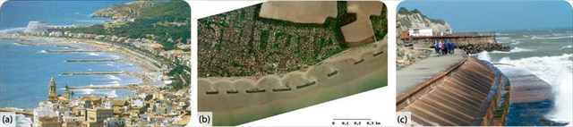 (a) Una ingle es una pila larga y estrecha de rocas construidas perpendicularmente a la costa para mantener la arena en la playa. ( b) Un rompeolas es una estructura construida en el agua paralela a la orilla para proteger la orilla de fuertes olas entrantes. (c) Un malecón es similar a un rompeolas excepto construido en tierra. Olas de tormenta extremadamente grandes pueden destruir la pared del mar, dejando la zona desprotegida