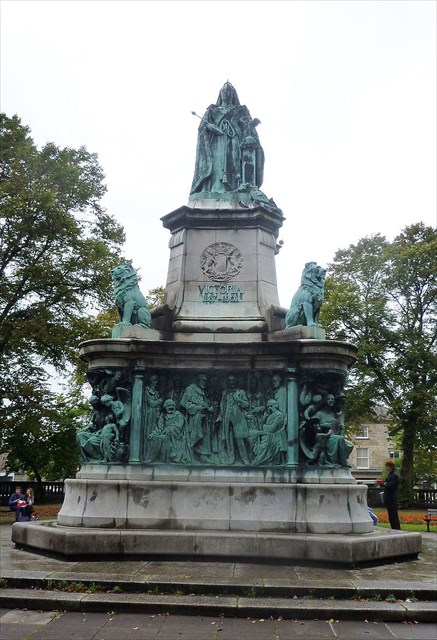 The pedestal sits on a tall square plinth with rounded corners accompanied by four bronze lions at the ordinal points. Around the plinth is an unbroken bas relief frieze of bronze. At the corners, facing ordinal points, are four figurative sculptures, each depicting an allegory of Freedom (northeast), Truth (southeast), Wisdom (southwest) and Justice (northwest).[2] On the four cardinal faces are near life size likenesses of fifty three prominent British figures from the Victorian era. Of the fifty three persons depicted upon the plinth of the Queen Victoria Monument only two are women: George Eliot and Florence Nightingale. Five of those depicted were born in Lancaster or the surrounding area: William Turner, Edward Frankland, Richard Owen, William Whewell, James Williamson, 1st Baron Ashton.