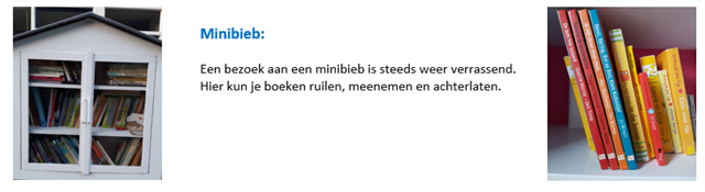 (Een prachtig initiatief, ooit in het leven geroepen door Nationaal Fonds Kinderhulp.) Een boekenkastje (minibieb), dat is gevuld met allerlei kinderboeken. Je kunt een boek uitkiezen en je mag het meenemen. De boeken zijn voorzien van een sticker op de voorkant, zodat het gelijk duidelijk is dat de boeken zo mee genomen mogen worden. Er zit ook een sticker aan de binnenkant, met daarin een zwerfcode. Heb je het boek gelezen, dan kun je het achterlaten bij een vriendje/vriendinnetje. Geef het door aan een klasgenootje of laat het boek achter in de supermarkt, een winkelcentrum of in de bus/trein. Je kunt bijhouden waar het boek blijft door dit online te registreren aan de hand van de zwerfcode die voorin het boek staat. Niet verplicht, maar wel zo leuk. Zo kan je met het boek meereizen. Het is dus echt de bedoeling dat de boeken gaan zwerven, zet ze dus na het lezen niet in je eigen kast, maar laat ze ergens anders achter.