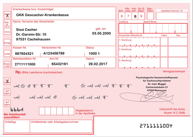 Sissi Cacher war in Behandlung in der psychologischen Praxis für Cachesuchtprobleme. Leider ist der Computer in der Praxis abgestürzt und Dr. med. Muggel musste das Kassenrezept per Hand ausfüllen.