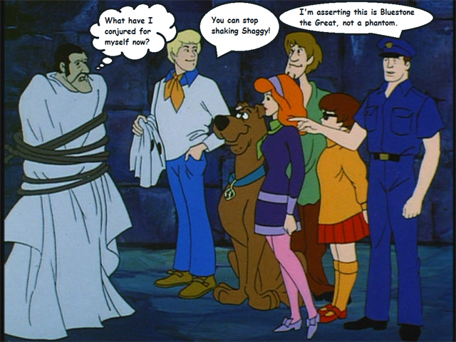 Take a look at the scene below from the episode from the first series of Scooby Doo Where Are You! In this episode, Hassle in the Castle, the gang run aground on an island featuring a spooky castle. There they meet a ghost that keeps trying to scare them off the island. The episode culminates with the phantom being unveiled to reveal the magician Bluestone.