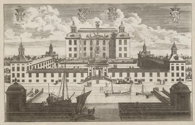 Kägleholm avbildat 1694 av Dahlberg/Swidde, ur Suecia antiqua et hodierna, publicerat med tillstånd från Kungliga biblioteket. Bilden möjligen något förskönad av konstnären?