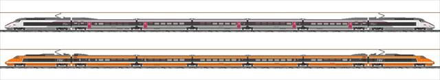 Pour la petite histoire, ici vous avez les dessins de deux TGV, le mytique TGV Atlantique reconnaissable à la livrée orange et le TGV Réseau avec la nouvelle livrée Carmillon.