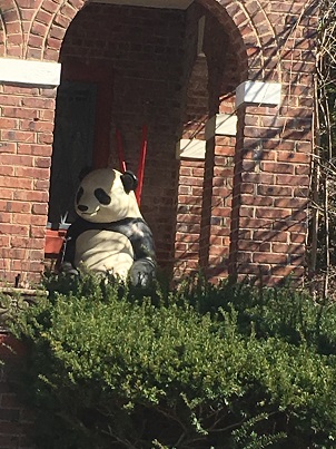 Flash forward almost nine months to the day, I finally set off in search of these pandas. As I approach 34th and Ordway, I notice the panda on the porch and take a deep breath. That panda's not naked! That panda is sitting on a bowl of ramen with chop sticks coming out the back. Over the years I have literally looked at hundreds of photos of the PandaMania pandas so I tend to recognize them on sight (especially after spending hours trying to get info on the Mystery Panda).