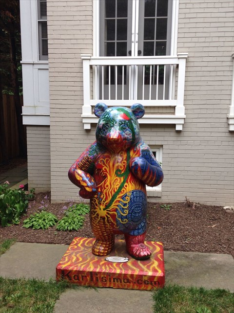 This is My Sacred Land by Karla Cecilia Rodas Cortez. This very colorful panda is adorned with Central American themes and images. The artist, who is of Mayan ancestry, designed the bear as an homage to her former homeland of El Salvador and claims her intention was to "depict the glory of ... indigenous cultures with their pyramid-temples that are still alive in our American Continent." .