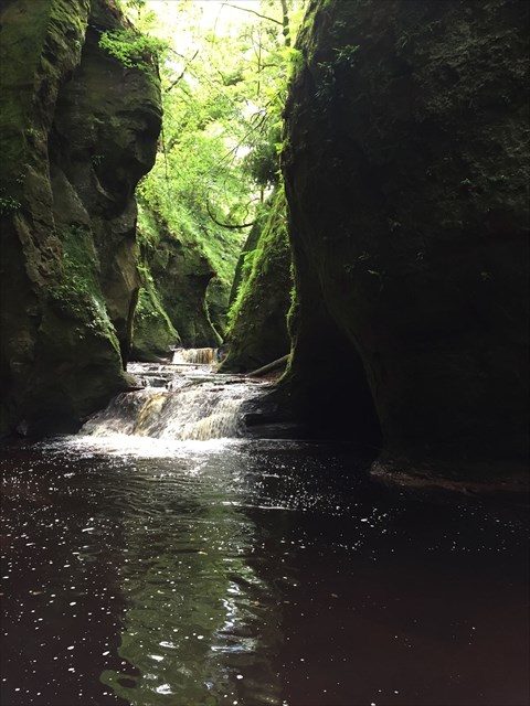There is not much published information on this canyon in particular but it is believed that this sandstone was first deposited during the Devonian Period as the Old Red Sandstone in the Stockiemuir Sandstone Formation, 382 - 372 million years ago (MacTaggart 1986). The red tinge to the cliff walls is due to ferric iron oxide haematite (Fe2O3) and these layers are around 400 metres thick. It is most commonly believed that the sandstone originated from widblown sands (Trewin 2008).