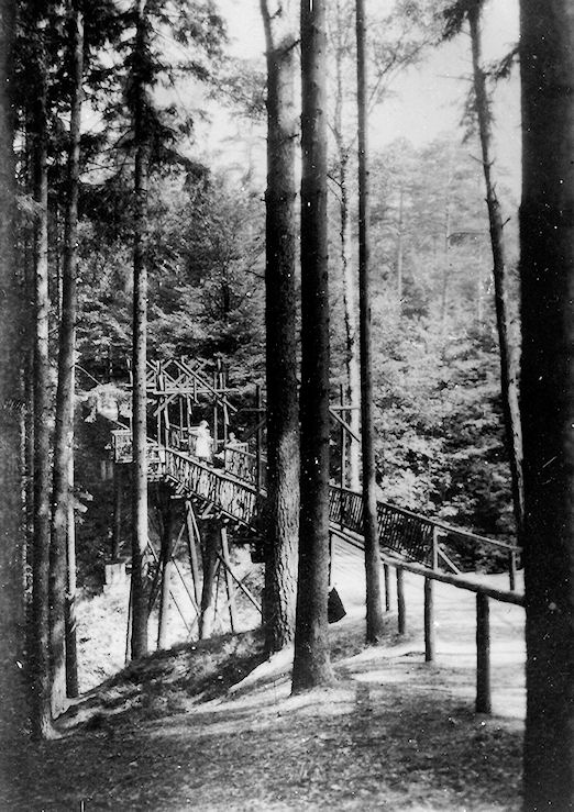 Die ehemalige Holzbrücke diente als Wanderwegbrücke. Auf dem ehemaligen Wanderweg vom Fuchsturm über die heutige Martinshöhe weiter in den Martinsgrund/Daliengarten.