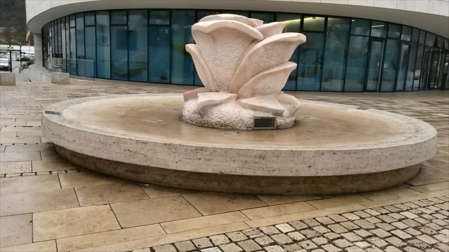 Inmitten dieses neuen Stadtviertels setzte Reinfried Pohl seiner verstorbenen Frau Anneliese ein Denkmal in Form eines Springbrunnens in Gestalt einer großen weißen Rose.