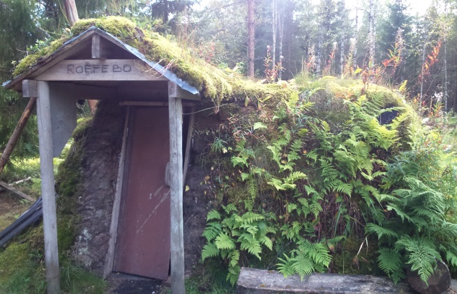 A full size charcoal kiln consists of a few hundred cubic meters of wood stacked and covered by spruce, sphagnum moss and soil or sand. The charcoal kiln is lit in the middle and the heat will spread out to the edges. The air supply to the charcoal kiln is very small so the wood will be heated and carbonized without burning. At the kiln there is usually one or several huts where the charcoal burners can stay overnight.