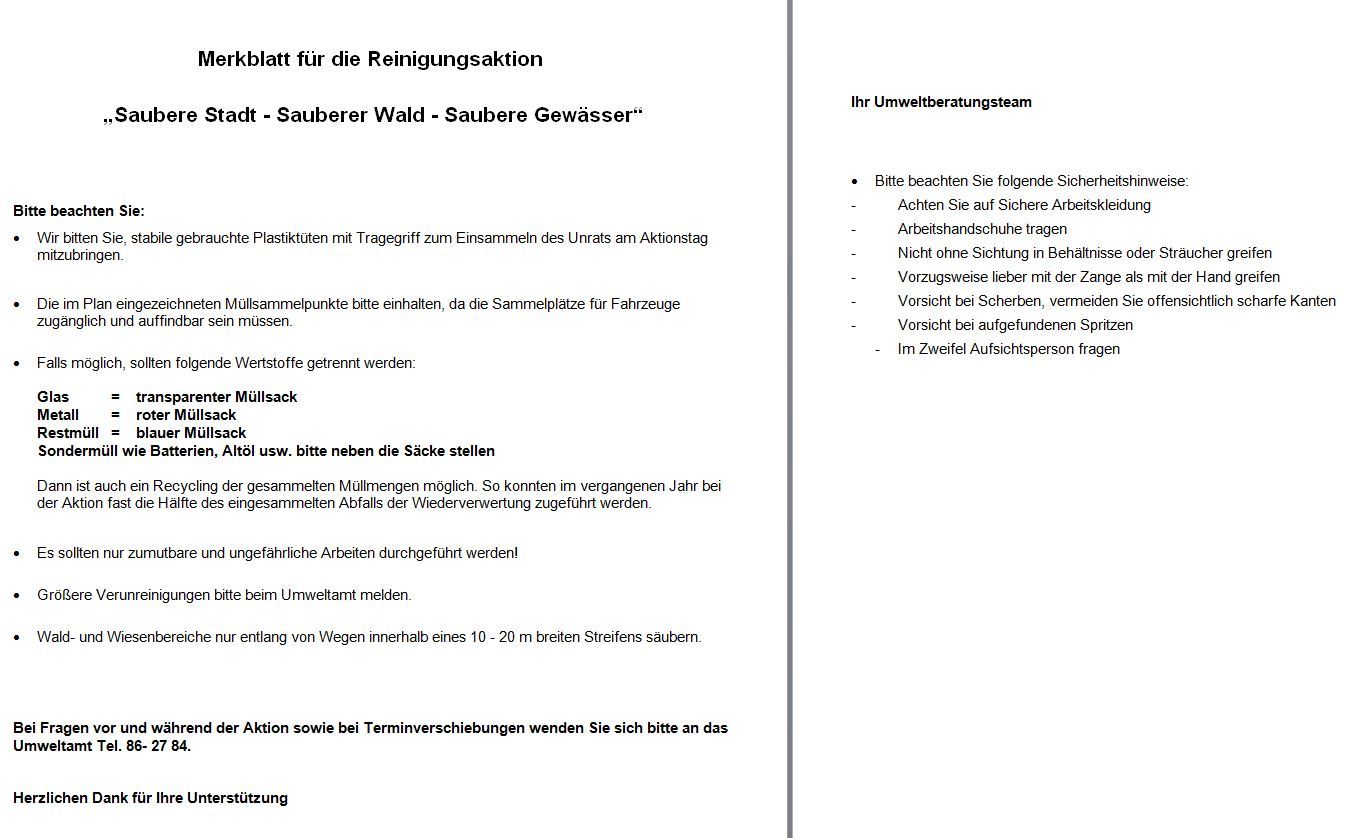 Es wird am Anfang der Aktion eine kurze Einweisung geben und eine Unterschriftenliste, in welche sich jeder Teilnehmer eintragen sollte, damit er während des Events über die Stadt Erlangen versichert ist. Das „Merkblatt für die Reinigungsaktion“ kann Vorab auch schon mal im Listing eingesehen werden – entbindet aber nicht sich Vor-Ort in die Liste einzutragen zum Versicherungsschutz.