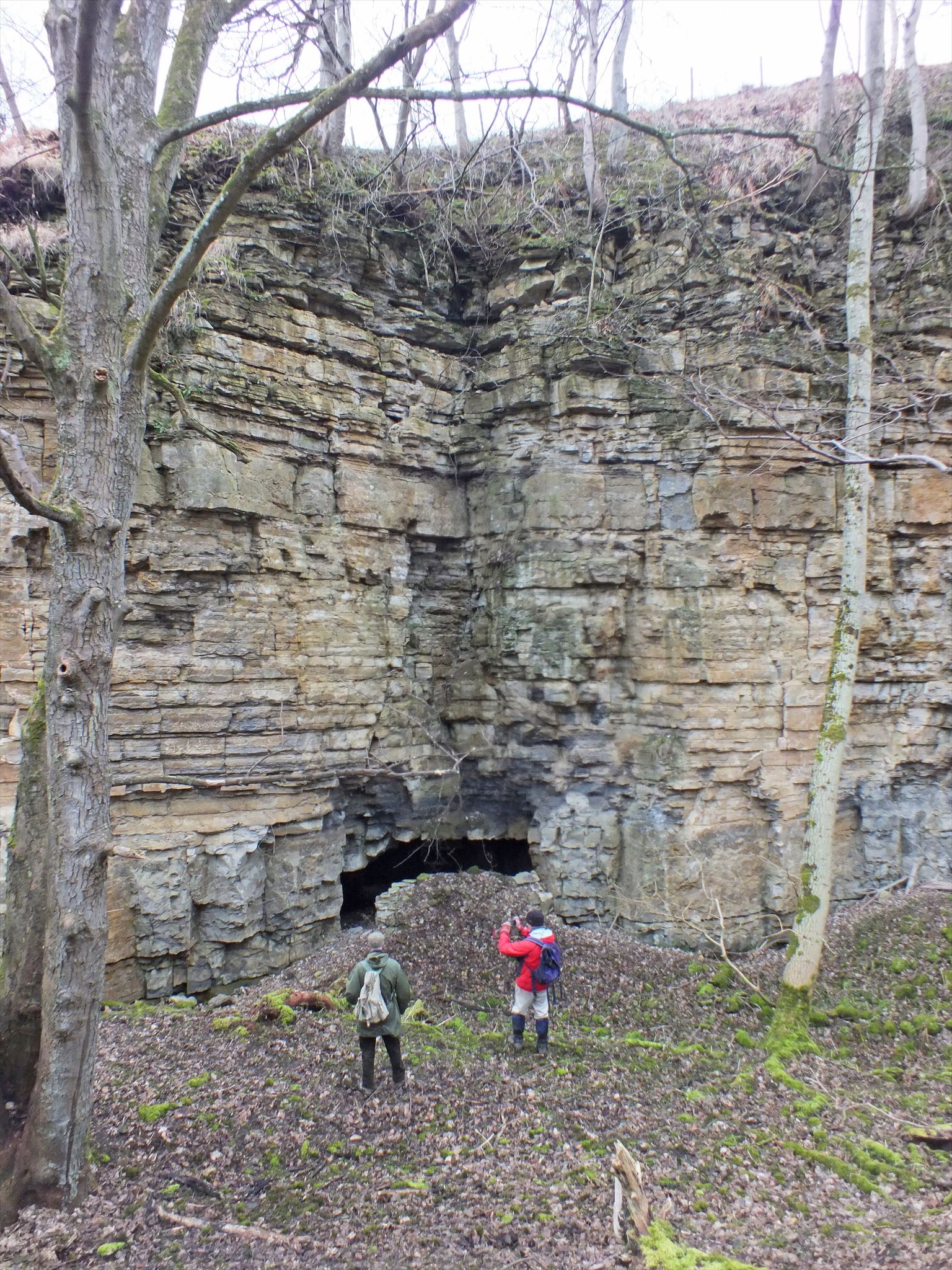 This is the face of an abandoned limestone quarry, the largest of many in this area which, little over a hundred years ago, teemed with the activity of quarrying and processing limestone. Limestone was either quarried straight off the face of the wall or by excavation. One such shaft is visible in the picture.