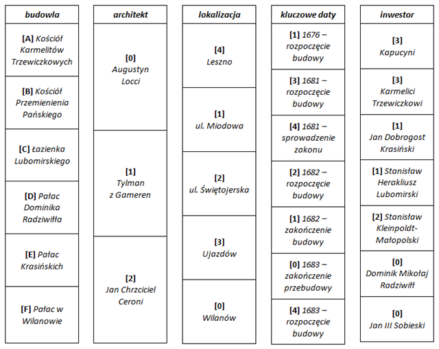 Dopasuj budowle do odpowiednich architektów, inwestorów, lokalizacji oraz pewnej specyficznej daty, a następnie zsumuj przypisane im cyfry według wzoru [A] = [0] + [1] + [2] + [3], co da wynik do wstawienia do współrzędnych. Bądź ostrożny, bo niektóre rozwiązania łączą się ze sobą w różny sposób! Jedną datę będzie trzeba znaleźć samodzielnie!
