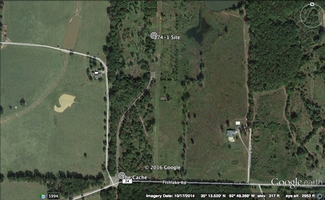 When you arrive at the posted coordinates, you will be standing at a gate blocking the old roadway to the abandoned missile site. The actual site is located on private land approximately 0.25 mile north of the cache location. (See photo below.)