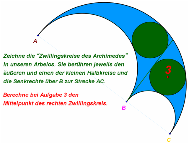 Diese 3 Punkte ergeben einen sogenannten Arbelos, wenn man diese Punkte mit 3 Halbkreisen untereinander verbindet. Wenn man danach eine spiegelsymmetrische Figur daraus macht, erhält man den Salinon. Für die einzelnen Fragen zur Lösung, werdet ihr dann im jeweils dazugehörigen Listing ein seperates Bild finden.