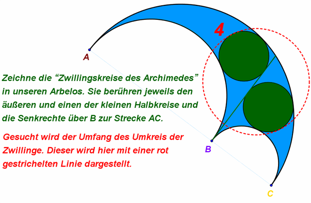 Diese 3 Punkte ergeben einen sogenannten Arbelos, wenn man diese Punkte mit 3 Halbkreisen untereinander verbindet. Wenn man danach eine spiegelsymmetrische Figur daraus macht, erhält man den Salinon. Für die einzelnen Fragen zur Lösung, werdet ihr dann im jeweils dazugehörigen Listing ein seperates Bild finden.