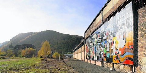 Die großen Wandbilder im Stil der 70er Jahre wurden erst 1977 ergänzt. Sie sind im Zuge des Umbaus nicht erhalten geblieben. Das linke Bild an der Stadthalle stammt von Willi Sitte. Das 25 m lange und 8,50 m hohe Wandbild bestand aus 874 wetterfesten Emailleplatten. Die üppigen nackten Figuren sorgten seinerzeit für erhebliche Verwunderung.