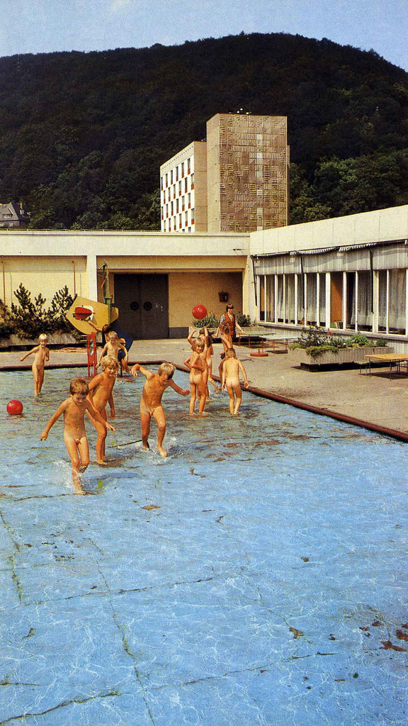 Im Sozialismus war vieles möglich. Die Kinder dieses Kindergartens planschen vergnügt im Pool auf der Dachterrasse des ersten Hauses am Platz. So sehr ich auch mit der DDR hadere; das Bemühen um die Kinder und die Jugend hatte auch ihre angenehmen Seiten.