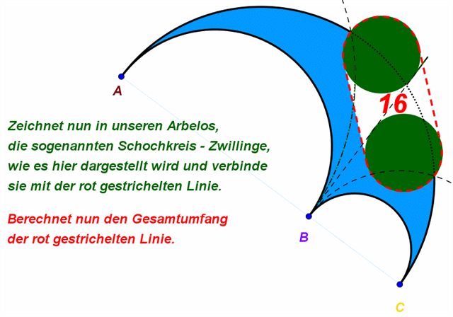 Diese 3 Punkte ergeben einen sogenannten Arbelos, wenn man diese Punkte mit 3 Halbkreisen untereinander verbindet. Wenn man danach eine spiegelsymmetrische Figur daraus macht, erhält man den Salinon. Für die einzelnen Fragen zur Lösung, werdet ihr dann im jeweils dazugehörigen Listing ein seperates Bild finden.