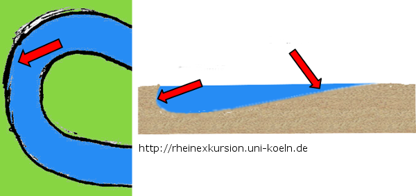 - Wie nennt sich das kurveninnere Ufer (im Strömungsschatten), an dem Material wegen der geringeren Strömung abgelagert wird?