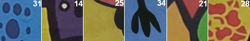 Blicke nach Süden. An der Fassade des Gebäudes erkennst Du große blaue Kühe. Es sind in Summe fünf, die die Nord- und Westfassade zieren. Ordne die Bildausschnitte von Nord nach Süd und weise dann den Werten auf den Bildern die Buchstaben A - F zu: