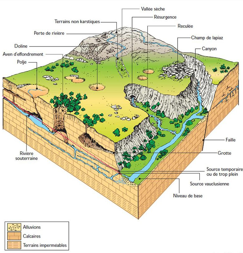 The aquifer of Beauce is one of the great French groundwater. It is a karstic aquifer filling the cavities and especially the cracks of the limestones of Beauce, lacustrine limestones deposited in the Oligocene terminal - Lower Miocene. This aquifer covers 9,000 to 10,000 km2, and has a capacity of about 20 billion m3 of water (18 times Lake Annecy). It is bounded by the Loir to the west, the Seine and some of its tributaries to the North and to the North-East, the Loing to the East and the Loire to the South. On the whole, it is a free slick, except in the region east of Orléans where it is covered with Miocene clays, and here and there when impermeable marshes are intercalated in the limestones . This water table is limited to its base by impermeable (predominantly clayey) levels of Eocene or Cretaceous higher than the South and West, lower Oligocene to Eocene elsewhere. In the northeast, this layer of Beauce limestones can be in continuity with slicks in the sands of Fontainebleau or other lower Oligocene and / or Eocene limestones.