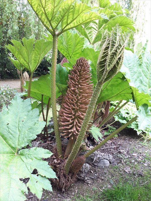 On trouve aussi des Gunneras, plantes originaires du Brésil qui affectionnent les terrains humides. Ces plantes existaient déjà du temps des dinosaures à l'époque du Carbonifère. Elles peuvent atteindre des tailles importantes, sinon en hauteur du moins dans la taille des feuilles : jusqu'à deux mètres d'envergure. Une seule feuille permettrait de faire un parapluie pour de nombreuses personnes. A méditer pour les familles de géocacheurs sous la pluie.
