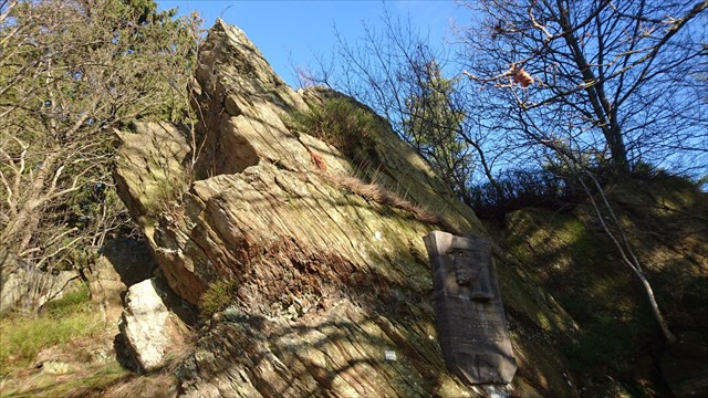 1.) Nehmt euch die Zeit und untersucht den Fels und die herumliegenden Gesteine. Schaut euch die recht frischen Bruchstellen links unterhalb der Löns-Skulptur in etwa 0,5 bis 1,0m Höhe einmal genau an. Anhand herausgefallener Pyritkristalle und vorhandener Kristalle bestimmt seine Größe und beschreibt das Aussehen. Könnt ihr eine Struktur ( Lupe )erkennen?