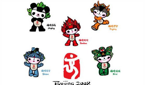 Después de fuertes polémicas y discrepancias respecto al animal más representativo de China se optó por elegir directamente a cuatro de ellos: el panda, el mono, el tigre y el dragón. El quinto representa a la llama olímpica. La elección de estos animales contiene mucho simbolismo ya que representan a los cinco colores de los anillos olímpicos y a los cinco elementos tradicionales chinos (metal, madera, agua, fuego y tierra).