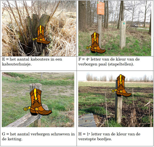 Je kunt je auto parkeren op bovenstaande coördinaten. Start bij WP1 en volg de groene wandelroute, je hoeft nergens van deze route te wijken. De wandeling is 3,7 km lang. Stop bij de aangegeven waypoints en zoek de juiste foto bij de plek.