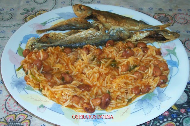 Assim que o arroz fritar um pouco junte as 3 chávenas de chá de água e deixe cozer o arroz, quando estiver quase cozido, junte o feijão, envolva, e deixe cozer tudo mais uns 3 a 4 minutos. De seguida polvilhe com os coentros picados, tape o tacho, deixe repousar um pouquinho e sirva.