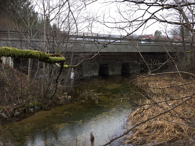 Under: Den gamle vegbrua ligg der framleis, men ikkje synleg frå E39, som går på ny bru over den gamle. Fotoet er teke frå jernbanetraseen ved Bergstøbrua.