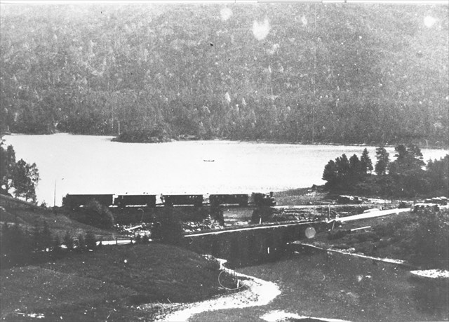 Over: Tog på veg sørover mot Os passerer over Bergstøbrua i 1920. Foto: Kaptein Tang, NGO.