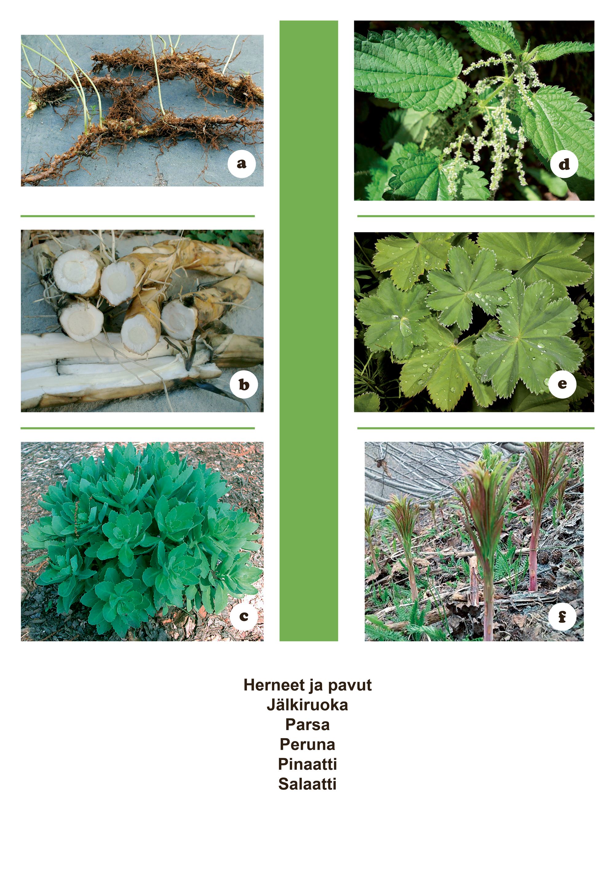 - Rönsyröllin (valkorölli), viitakastikkaan, nurmilauhan, niittynurmikan, koiranvehnän, kanarianheinän (kanarianhelpi), viljahirssin (kananhirssi), viherpantaheinän, heinäkauran ja rantakauran valkoiset varhaiskevään juurisilmut ovat syötäviä sellaisenaan, nuoret vihreät versot vihannesten tapaan.
