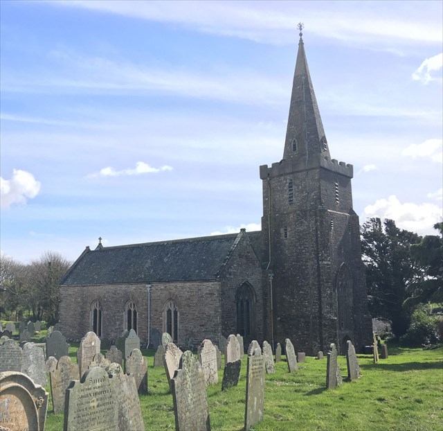 A little information about Bigbury's church, dedicated to St Lawrence. The church is part early 14th century and part 19th centry as it was rebuilt rebuilt by J. D. Sedding in 1872. Apart from the western tower topped by a spire very little is obviously medieval. The two monumental brasses are early 15th century. The baptismal font, sedilia and piscina are early 14th century, while the lectern and pulpit date from the following century. Both the lectern and pulpit were moved here from Ashburton church: the lectern is attributed to Thomas Prideaux and thought to be a donation of the Bishop of Exeter ca. 1510-15