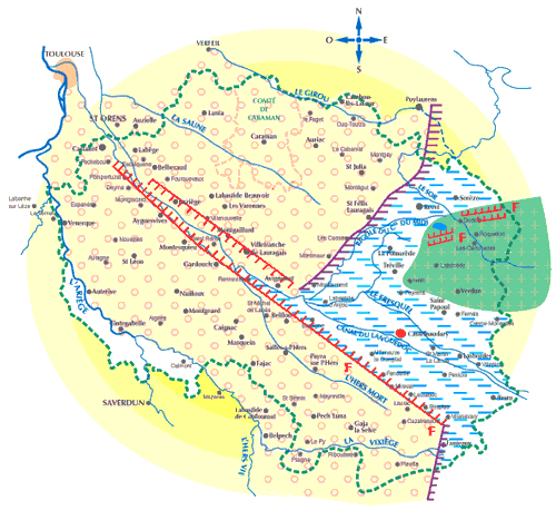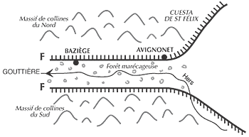 Cet immense massif de collines est coupé en deux par la gouttière de l'Hers mort.